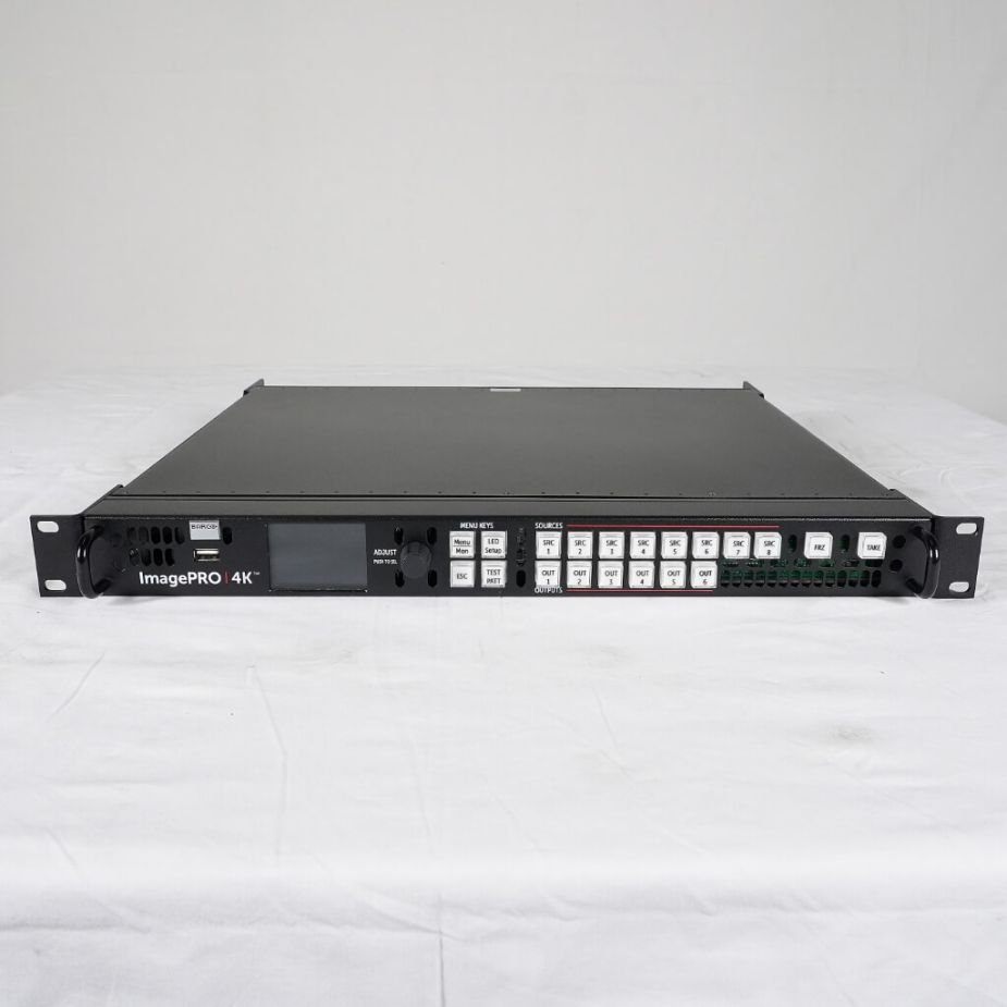 The ImagePRO-4K Processor from Barco easily scales, converts, and switches the highest quality signals without latency (4K, 4:4:4, 60p, 10-bit), effectively solving glitches before they even occur. The latest I/O connectors enable you to seamlessly convert HDMI 2.0, DP 1.2, and 3G-12G SDI signals while also enabling output image rotation. The ImagePRO-4K is built for life on the road. Assembled and tested for extreme use and abuse, the ImagePRO-4K performs just as well at the gig as it does in the shop.
